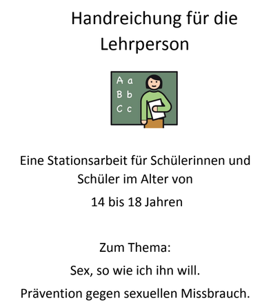 Dieses Material, eine Handreichung für Lehrpersonen zum Thema Sex, so wie ich ihn will, erklärt eine Stationsarbeit zum genannten Thema. Die Arbeitsaufgabe selbst gliedert sich in vier verschiedene Stationen, die jeweils die Themenschwerpunkte Geheimnisse, Gefühle, körperliche Selbstbestimmung und Mein Körper und Ich haben.